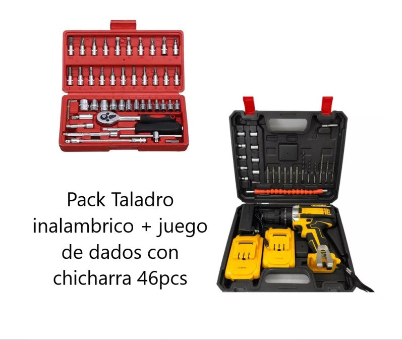 Pack Taladro Inalámbrico 98v 2 Baterias + Acc +Juego Caja Set Dados Chicharra 46 pcsDescripciones:Este taladro inalámbrico ofrece varios beneficios para ti, para el que quiere tener un excelente aliado para tareas diarias de construcción, armado de muebles y más. Gracias a su batería y liviano peso es ideal portarlo en todo momento, esto hace que sean ideales para trabajos al aire libre, construcción de jardines, colocación de faroles, etc.Características:Perfora, atornilla y más. Arma todo lo que siempre deseaste de forma rápida y segura.Lleva a todos lados tu atornillador, cuenta con batería por lo que hacer inalámbrico podrás trabajar en todas partes de tu casa, al aire libre, y más.Especificaciones:Marca: Tasbel - Color Azul y Amarillo AleatorioModelo: Taladro inalámbrico Potencia: 98V2 x Batería recargableMax par: 35NVoltaje: 220VSet Broca MaderaSet Broca LadrilloSet Broca CerámicaJuego de dados 1/4 " DR .46 Piezas, en maletín plástico.MODELO TRHN-46ACONTENIDO HERRAMIENTAS 46 Piezas .MEDIDAS: 1/4"CONTENIDO:DADO MÉTRICO 13Pzs 1/4 "DR.DADOS BITS 21Pzs 1/4 "DR.LLAVE TUERCA 3PzsHEXUNION UNIVERSAL 1Pz 1/4 "DR.EXTENSIÓN FLEXIBLE 1Pz 1/4 "DR.BARRA DESLIZANTE EN T 1Pz 1/4 "DR.MANGO DE CHICHARRA RÁPIDO 1Pz1/4 "DR. / 72TBARRA DE EXTENSIÓN 2Pzs 1/4 "DR.MANGO GIRATORIO 1Pz 1/4 "DR.ADAPTADOR DE BITS 1Pz 1/4 "DR.